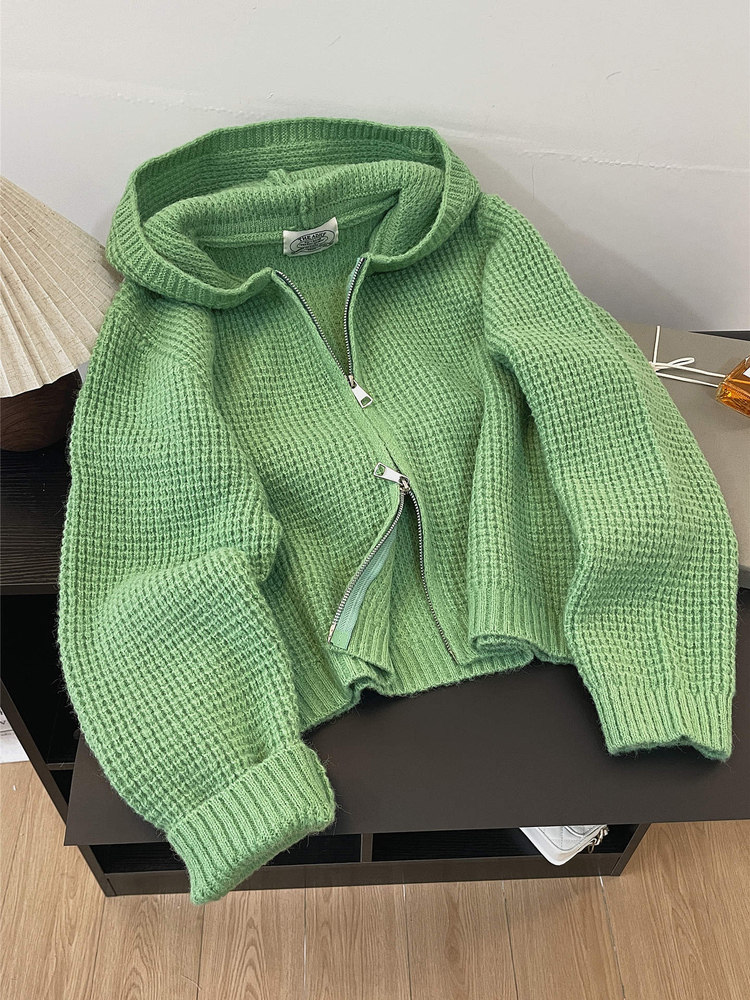 Korean Chic Autumn and Winter Lazy Loose Green Hooded Knitted Cardigan Short Style Elegant Zipper Sweater Jacket for Women Thick